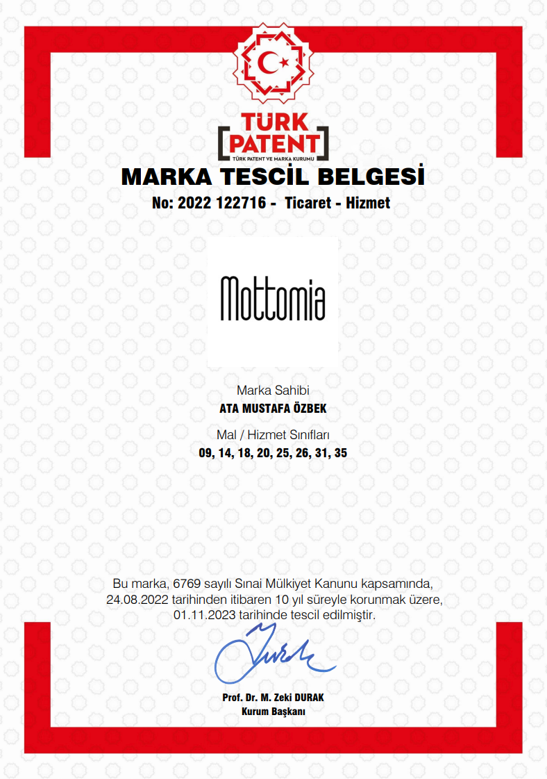 MOTTO MIA ismi, “Benim Mottom” veya “Benim Felsefem” anlamını taşıyan dinamik yapısıyla, bireysel ifadenin ve kişisel tarzın ön planda olduğu moda, kırtasiye ve yaşam tarzı sektörleri için eşsiz bir marka potansiyeli sunmaktadır. İtalyan esintili tınısı ve ritmik fonetiği sayesinde, tüketici zihninde enerjik, genç ve stil sahibi bir algı yaratır.